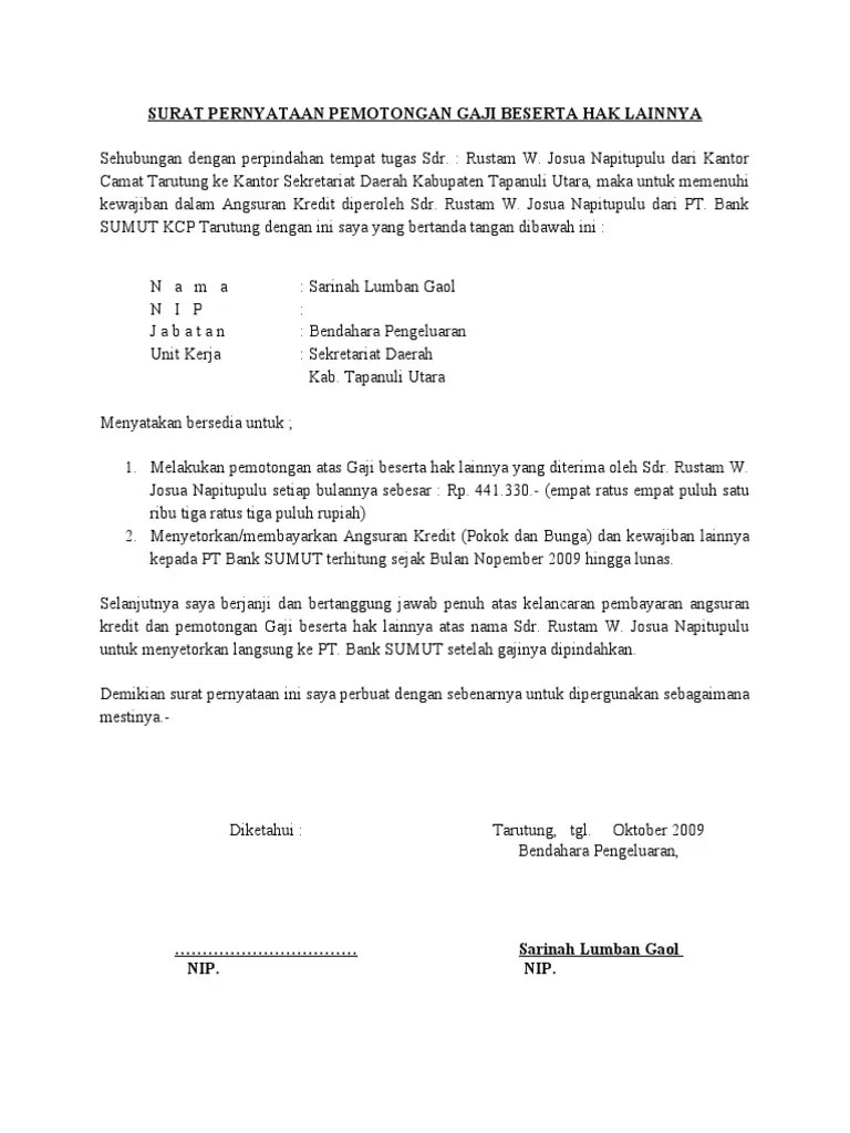 Atas pelanggaran yang telah dilakukan . Surat kuasa penerima pemotongan gaji. Read 19 draf surat kuasa untuk melakukan pemotongan gaji karyawan by arif edison lawyer on issuu and browse thousands of other publications . Surat pemberitahuan tentang kenaikan gaji berkala sptkgb tanggal. Yang bertanda tangan di bawah ini: Surat pernyataan kesediaan pemotongan tunjangan kerja yang bertanda tangan dibawah ini : 19720401 199403 2 003 unit kerja . Saya yang bertandatangan dibawah ini :.